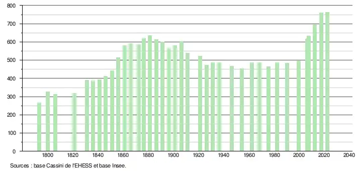 | L'évolution du nombre d'habitants est connue à travers les recensements de la population effectués dans la commune depuis 1793. Pour les communes de moins de 10 000 habitants, une enquête de recensement portant sur toute la population est réalisée tous les cinq ans, les populations de référence des années intermédiaires étant quant à elles estimées par interpolation ou extrapolation[27]. Pour la commune, le premier recensement exhaustif entrant dans le cadre du nouveau dispositif a été réalisé en 2007[28]. En 2022, la commune comptait 763 habitants[Note 4], en évolution de +2,83 % par rapport à 2016 (Landes : +5,78 %, France hors Mayotte : +2,11 %). |