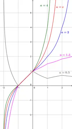 Cependant, si a ≠ e, la fonction ainsi définie est seulement dérivable par morceaux: à des valeurs entières de x, la dérivée est multipliée par entre deux intervalles: