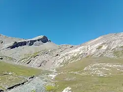 La tête Sud des Fours vue depuis l'ouest non loin du col des Fours ; au premier plan, la formation des Grès Singuliers. | |||