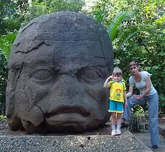 Les têtes colossales olmèques sont des sculptures monolithiques représentant des têtes humaines en ronde-bosse de grande taille. Taillées dans des rochers en basalte, elles datent au moins de 900 av. J.-C. et sont représentatives de la civilisation olmèque en Mésoamérique[1]. Des 17 têtes colossales connues, toutes représentent des hommes d'âge mûr avec des joues bien en chair, un nez plat et un léger strabisme. Chacune des statues comporte une coiffe distinctive. L'arrière des monuments est souvent plat. Les rochers proviennent des montagnes de la Sierra de los Tuxtlas de Veracruz ; comme les pierres utilisées pour la production des statues ont été transportées sur de grandes distances, nécessitant beaucoup de ressources et d'efforts humains, on pense que ces monuments sont les portraits de dirigeants olmèques puissants. Les têtes sont arrangées en lignes ou groupes sur des centres olmèques majeurs, mais la méthode et la logistique de leur transport sur ces sites restent peu claires.