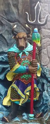 Tête de bœuf, Visage de cheval (chinois simplifié : 牛头马面 ; chinois traditionnel : 牛頭馬面 ; pinyin : ; Wade : niu²-t'ou² ma³-mien⁴) est une histoire à propos de deux personnages, Tête de bœuf (牛头 / 牛頭, , Wade : niu²-t'ou², « tête de bœuf ») et Visage de cheval (马面 / 馬面, , Wade : ma³-mien⁴, « visage de cheval ») sont deux gardiens et assistants du second juge du Diyu, correspondant à l'Au-delà ou à l'Enfer dans la mythologie chinoise[1]. Comme l'indiquent leurs noms, tous deux ont des corps humains, mais Tête de bœuf possède la tête d'un bœuf, tandis que Visage de cheval a celle d'un cheval. Ils sont les premiers êtres que l'âme d'un mort rencontre à l'entrée du monde souterrain ; dans de nombreuses histoires, ils escortent directement les morts jusqu'au Diyu. Dans la mythologie japonaise, Tête de bœuf et Visage de cheval sont connus sous les noms de Gozu et Mezu, respectivement, la traduction japonaise est (tête de bœuf et tête de cheval (牛頭馬頭, gozu mezu).