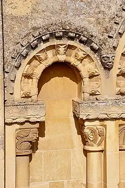 Double rangée de têtes sur l'archivolte et les piedroits à Windrush (Gloucestershire)