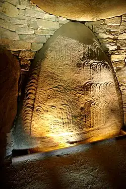 Sur sa face interne, la dalle de chevet est ornée, au centre de quatre registres symétriquement opposés composés du motif des crosses, et sur le contour d'un motif interprété comme le profil anthropomorphe de la « déesse Mère à la chevelure rayonnante » selon Le Roux ou comme un symbole phallique selon Cassen[6]. Les crosses étant un augmentatif de puissance, cette face ornée dirigée vers la rivière d'Auray aurait eu pour objet d'envoyer un message d'avertissement à l'attention de ceux qui aborderaient la presqu'île[24],[25]. Sur sa face externe, elle comporte un motif constitué d'un double arc radié surmontant une figure quadrangulaire et une forme en « croissant de lune » que Cassen interprète comme un arc-en-ciel (le ciel) surmontant un habitat-monde (la terre) et un bateau (la mer)[26].