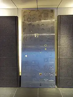 Il s’agit d’une seconde planche taillée dans la même matière que la précédente. Les détails sont aussi représentés par des coupes différentes dans les couches qui se succèdent dans la formation de cette grande plaque, qui présente un répertoire de pictogrammes choisi par le sculpteur. Ceux-ci font partie de la vie quotidienne et servent principalement à l’aboutissement d’une action. Ils peuvent aussi servir à orienter, identifier, interdire, identifier. Le but d’avoir mis en évidence ces dessins figuratifs est de faire comprendre une chose sans avoir à le transmettre oralement tout comme le design le propose. Chacun d’eux est accessible à tous les gens qui les regardent puisqu’ils sont indifférents à la provenance de ceux-ci, à leur langue respective ainsi qu’à leur culture. Le message que passent ces images est compréhensible du premier coup d’œil. Cette dernière partie du diptyque s’adresse à une expérience personnelle pour construire sa propre extrapolation par rapport à son imagination et son vécu.