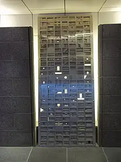 La première planche d'inox, le premier volet de la composition, présente les 192 drapeaux des pays membres des Nations unies. Tous ces emblèmes ainsi rassemblés forment un réseau d’identification commun qu’est le regroupement des Nations unies. Michel Goulet explique : « Nommer chacun des pays et chercher à les reconnaître, c’est reconnaître les différences, les particularités et les expériences personnelles. » Cependant, en ayant recueilli tous ces emblèmes et en les représentant de cette manière, le sculpteur cherche à insister sur les aspects suivants : le rassemblement, le partage à parts égales d’un espace commun et la mise en perspective pour l’individu qui s’y sent confronté. Par rapport à l’objet, les drapeaux ont les mêmes dimensions et sont répartis à de façon symétrique sur le panneau qui forme l’ensemble c’est-à-dire ce regroupement pacifique. Les quatre vides n’ont aucune signification particulière. Ils sont placés au hasard.