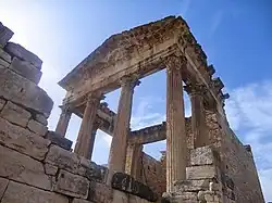 Vue de Téboursouk, sur le plateau tunisien- Carte de l'Africa Vetus et des royaumes clients de Numidie et de Maurétanie. À l'époque de la révolte de Tacfarinas, la Numidie a déjà été intégrée à la province d'Africa Proconsularis.