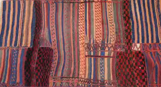 La partie centrale du tacheh tissée en kilim est posée sur le dos de l'animal de somme. La partie de nouage correspond au fond des deux sacs. Certains tachehs présentent le motif à carreaux, blancs et noirs ou blancs et rouges ou noirs et rouges (kheshti), d'autres le dessin « à arête de poisson » ou le dessin à boteh à fleurs[2].