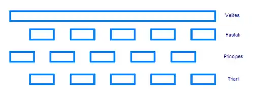 L'infanterie romaine se déployait face à l'ennemi et à l'époque de la République, elle se déployait en trois lignes dans une formation appelée « triplex acies », chacune d'entre elles avait généralement huit rangs en profondeur. Les hastati formaient la première ligne (la plus proche de l'ennemi), les principes tenaient la deuxième ligne et les vétérans triarii occupaient la troisième ligne. Ceux-ci empêchaient la panique ou une retraite non autorisée des premiers rangs et étaient parfois utilisés comme réserve dans la bataille. En cas de défaite imminente, les première et deuxième lignes se reformaient derrière la ligne des triarii en vue d'une contre-attaque ou d'une retraite ordonnée. Comme recourir aux triarri n'arrivait que dans les cas extrêmes, l'expression latine ad triarios rediisse (tomber sur les triarii) signifiait une situation désespérée[1].