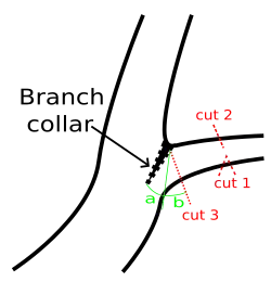 Lors de la taille d'une grosse branche, on procède en trois étapes pour faire une coupe propre et faciliter la vitesse de cicatrisation des plaies, portes d'entrée des champignons lignivores. Pour éviter la déchirure[5] (notamment lors des tailles en vert ou pour les branches lourdes), effectuer la coupe 1 (deux traits) puis 2. La taille en bais définitive 3 est réalisée au niveau de l'empattement.