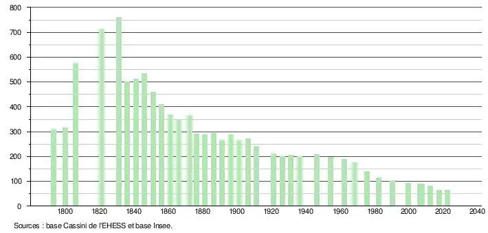 L'évolution du nombre d'habitants est connue à travers les recensements de la population effectués dans la commune depuis 1793. Pour les communes de moins de 10 000 habitants, une enquête de recensement portant sur toute la population est réalisée tous les cinq ans, les populations de référence des années intermédiaires étant quant à elles estimées par interpolation ou extrapolation[25]. Pour la commune, le premier recensement exhaustif entrant dans le cadre du nouveau dispositif a été réalisé en 2007[26].