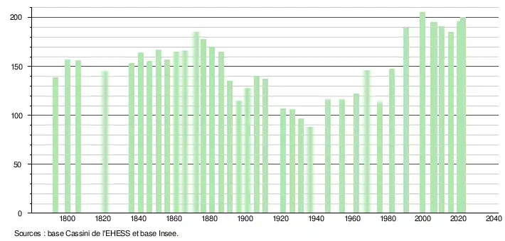 L'évolution du nombre d'habitants est connue à travers les recensements de la population effectués dans la commune depuis 1793. Pour les communes de moins de 10 000 habitants, une enquête de recensement portant sur toute la population est réalisée tous les cinq ans, les populations de référence des années intermédiaires étant quant à elles estimées par interpolation ou extrapolation[12]. Pour la commune, le premier recensement exhaustif entrant dans le cadre du nouveau dispositif a été réalisé en 2005[13].