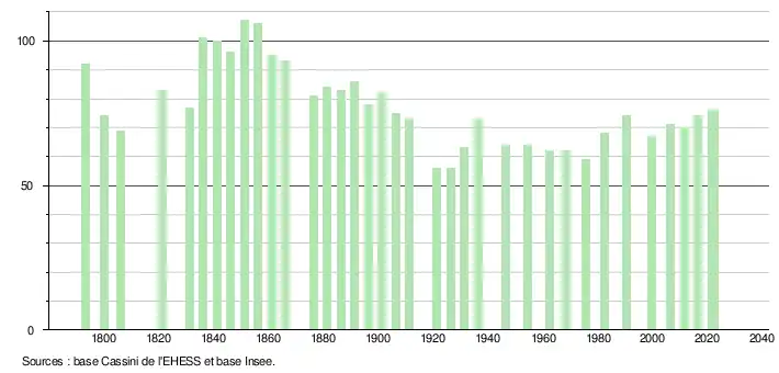 L'évolution du nombre d'habitants est connue à travers les recensements de la population effectués dans la commune depuis 1793. Pour les communes de moins de 10 000 habitants, une enquête de recensement portant sur toute la population est réalisée tous les cinq ans, les populations de référence des années intermédiaires étant quant à elles estimées par interpolation ou extrapolation[30]. Pour la commune, le premier recensement exhaustif entrant dans le cadre du nouveau dispositif a été réalisé en 2006[31].
