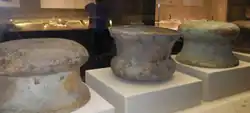 La famille des bronzes cérémoniels, vases ou urnes, cloches ou tambours, fut élaborée à partir des qualités reconnues du nouvel alliage de cuivre : beauté, sonorité, adaptabilité, solidité, pérennité sinon éternité. La fonte du bronze maîtrisée, après les pointes de flèche et les chaudrons réussis, les artisans vont développer, de fin BCE au CE, la production d‘objets cérémoniels dont la parenté est visible, qu'il s'agisse de leurs décorations ou de leurs usages, souvent musicaux. Ci-contre, comparées à un tambour vietnamien de référence (Sông Đà), des trouvailles de « cloche » et « d'urne » faites au Cambodge, ou encore de « bassine/tambour » au Vietnam, attestant d'une grande famille de bronzes cérémoniels.
