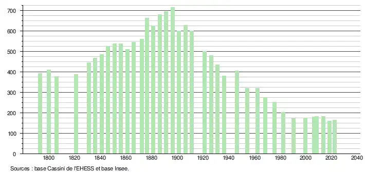 L'évolution du nombre d'habitants est connue à travers les recensements de la population effectués dans la commune depuis 1793. Pour les communes de moins de 10 000 habitants, une enquête de recensement portant sur toute la population est réalisée tous les cinq ans, les populations de référence des années intermédiaires étant quant à elles estimées par interpolation ou extrapolation[13]. Pour la commune, le premier recensement exhaustif entrant dans le cadre du nouveau dispositif a été réalisé en 2008[14].