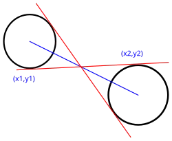 En général les points de tangence t1 et t2 pour les quatre droites tangentes aux deux cercles avec pour centres v1 et v2 et pour rayons r1 et r2 sont donnés en résolvant les équations vectorielles suivantes :