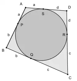Cette conclusion suit l'égalité des segments tangents des quatre côtés d'un quadrilatère. On note les points de tangence P (sur le côté AB), Q (sur le côté BC), R (sur le côté CD) et S (sur le côté DA). Les segments tangents symétriques par rapport à chaque point de ABCD sont égaux : BP = BQ = b, CQ = CR = c, DR = DS = d et AS = AP = a. Mais chaque côté du quadrilatère est composé de deux tels segments tangents :
