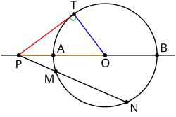 Aucune tangente ne passe par un point intérieur au cercle, car elle serait dès lors une sécante. Cependant, par un point extérieur P au cercle, il passe deux tangentes au cercle. La figure géométrique qui résulte de cette construction a une symétrie axiale le long de la droite passant par P et le centre du cercle. Ainsi, les longueurs des segments entre P et les points de tangence sont égaux. Par le théorème sécante-tangente, le carré de cette longueur de tangente est égale à la puissance du point par rapport au cercle. Cette puissance est égale au produit des distances de P à chacun des deux points d'intersection du cercle avec une sécante passant par P.