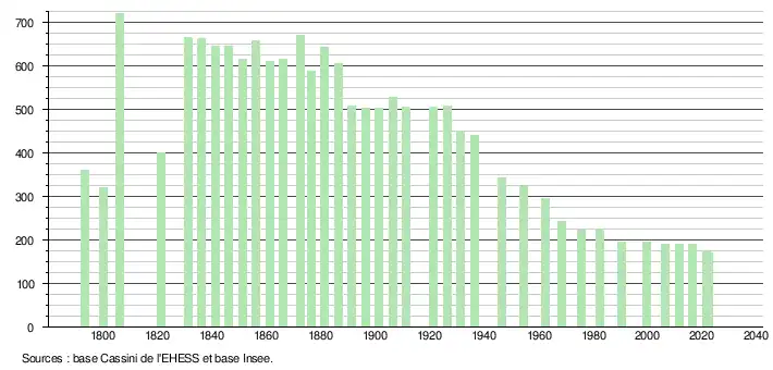 L'évolution du nombre d'habitants est connue à travers les recensements de la population effectués dans la commune depuis 1793. Pour les communes de moins de 10 000 habitants, une enquête de recensement portant sur toute la population est réalisée tous les cinq ans, les populations de référence des années intermédiaires étant quant à elles estimées par interpolation ou extrapolation[41]. Pour la commune, le premier recensement exhaustif entrant dans le cadre du nouveau dispositif a été réalisé en 2006[42].