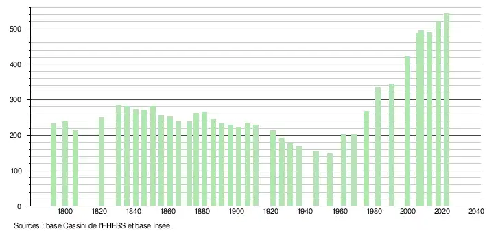 L'évolution du nombre d'habitants est connue à travers les recensements de la population effectués dans la commune depuis 1793. Pour les communes de moins de 10 000 habitants, une enquête de recensement portant sur toute la population est réalisée tous les cinq ans, les populations de référence des années intermédiaires étant quant à elles estimées par interpolation ou extrapolation[43]. Pour la commune, le premier recensement exhaustif entrant dans le cadre du nouveau dispositif a été réalisé en 2007[44].