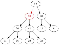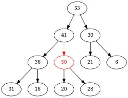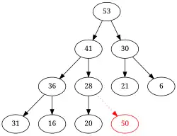On compare 50 et son père 53. Comme 50 < 53, on n'échange pas les positions de 50 et 53, et on a fini de modifier notre arbre. Il respecte à présent toutes les contraintes d'un arbre binaire.