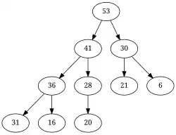 - C'est un tas : l'étiquette, appelée également clé ou key, de chaque nœud, doit être, soit supérieure ou égale, soit inférieure ou égale aux étiquettes de chacun de ses fils. La signification de supérieur ou égal dépend de la relation d'ordre choisie.