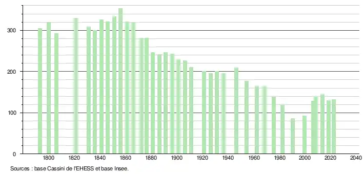 L'évolution du nombre d'habitants est connue à travers les recensements de la population effectués dans la commune depuis 1793. Pour les communes de moins de 10 000 habitants, une enquête de recensement portant sur toute la population est réalisée tous les cinq ans, les populations de référence des années intermédiaires étant quant à elles estimées par interpolation ou extrapolation[16]. Pour la commune, le premier recensement exhaustif entrant dans le cadre du nouveau dispositif a été réalisé en 2008[17].