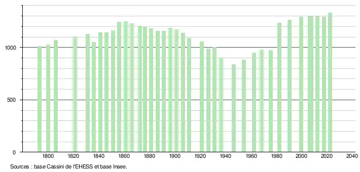 L'évolution du nombre d'habitants est connue à travers les recensements de la population effectués dans la commune depuis 1793. Pour les communes de moins de 10 000 habitants, une enquête de recensement portant sur toute la population est réalisée tous les cinq ans, les populations de référence des années intermédiaires étant quant à elles estimées par interpolation ou extrapolation[20]. Pour la commune, le premier recensement exhaustif entrant dans le cadre du nouveau dispositif a été réalisé en 2007[21].