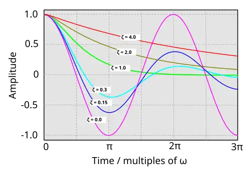 Différents régimes de retour à l'équilibre en fonction de la valeur du taux d'amortissement ζ. Les régimes apériodique (ζ>1), critique (ζ=1), pseudo-périodique (ζ<1) et harmonique (ζ=0). La courbe représente les oscillations (x(t)) relatives à la position de départ (x(0)) d'un oscillateur mécanique à une dimension sans vitesse initiale. ω0 est la pulsation propre du système.