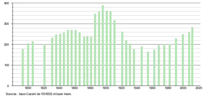 L'évolution du nombre d'habitants est connue à travers les recensements de la population effectués dans la commune depuis 1793. À partir du , les populations légales des communes sont publiées annuellement dans le cadre d'un recensement qui repose désormais sur une collecte d'information annuelle, concernant successivement tous les territoires communaux au cours d'une période de cinq ans. Pour les communes de moins de 10 000 habitants, une enquête de recensement portant sur toute la population est réalisée tous les cinq ans, les populations légales des années intermédiaires étant quant à elles estimées par interpolation ou extrapolation[5]. Pour la commune, le premier recensement exhaustif entrant dans le cadre du nouveau dispositif a été réalisé en 2007[6],[Note 1].