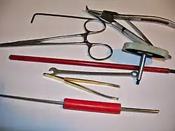 Pour réparer cette machine, il fallait des petits outils, comme une clé à fourche, des clés Allen[2], une pince brucelles, un crochet à ressort, une pince à circlips, des pinces etc. Sur l'image 23, on voit quelques-uns de ces outils spéciaux pour la petite mécanique.