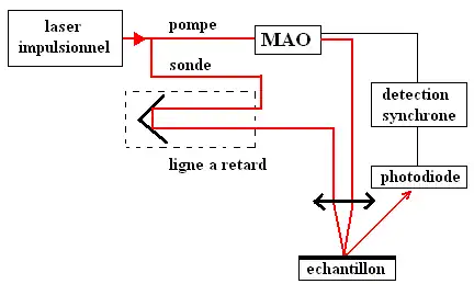 Le principe général est le suivant (voir figure ci-contre) : une impulsion laser de pompe permet de générer un paquet d'ondes acoustiques qui va se propager dans l'échantillon. Le faisceau sonde, décalé en temps grâce à une ligne à retard, permet de mesurer les variations de réflectivité en fonction du temps. Les signaux à détecter étant faibles, on utilise un modulateur acousto-optique (MAO) associé à une détection synchrone.