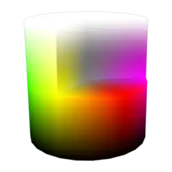 Avec trois dimensions, la représentation géométrique d'un système Teinte, saturation, lumière de description des couleurs est un volume. Deux des valeurs forment un système de coordonnées polaires, avec la teinte en angle et la saturation, comprise entre 0 et 1, en module. Le système se représente donc comme un cylindre[19].