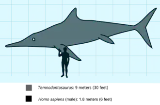 Temnodontosaurus est l'un des plus grands ichthyosaures ayant été identifiés à ce jour, bien que les différentes espèces qui composent le genre ne soient pas aussi imposantes que Shonisaurus, Himalayasaurus (en), Cymbospondylus ou encore Ichthyotitan[9],[2]:83,[58]. Il représente néanmoins le plus grand ichthyosaure connu du groupe des parvipelviens[59]. Sur la base de différents spécimens, les espèces T. platyodon, T. trigonodon et T. crassimanus ont une taille corporelle qui est estimée aux alentours de 9 m de long[4],[9],[53],[2]:83,[6]. Le « dragon des mers de Rutland », un possible spécimen de T. trigonodon découvert en dans le Rutland Water, près d'Oakham, a une taille estimée à légèrement plus de 10 m de long[25]. La taille du crâne varie également entre ces trois espèces. Les plus grands crânes connus de T. trigonodon et T. platyodon mesurent respectivement 1,8 m[53],[2]:83 à 1,9 m de long[60]:152-153. Bien qu'incomplet, le spécimen holotype de T. crassimanus aurait eu un crâne estimé aux alentours de 1 m de long[6]. Aucune estimation de la longueur corporelle des espèces T. zetlandicus et T. nuertingensis n'ont actuellement été données. Cependant, la mensuration de leur crâne, atteignant respectivement 1 à 1,3 m de long, laisse suggérer qu'il s'agisse de représentants plus petits quand ils sont comparés aux trois espèces précédemment mentionnées[8],[7].