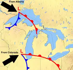 Pendant l'automne, l'air froid et sec du nord du Canada descend au sud et rencontre l'air chaud et humide provenant du Golfe du Mexique, formant de larges systèmes dépressionnaires sur le centre du continent. Plusieurs de ces systèmes passent sur les Grands Lacs où ils se font réchauffer par les eaux encore près de leur maximum estival de température. Cet échange de chaleur ralentit l'entrée de l'air arctique dans la région, ce qui permet aux lacs de rester relativement chauds durant plus longtemps.