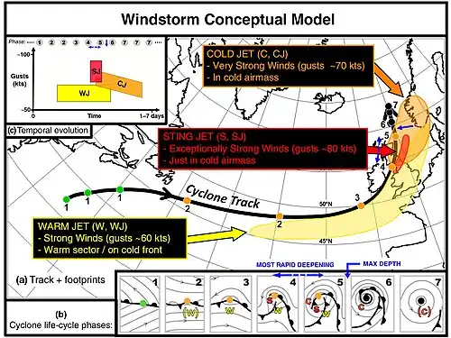 L'image de droite montre le modèle conceptuel de la relation entre la trajectoire (ligne noire) des tempêtes et le corridor des vents les plus intenses (zones colorées)[5]. Les points verts montrent l'endroit où les vents s'intensifient près d'un front stationnaire lorsque le système commence à se former. Lors de l'intensification, il est ensuite deux zones de vents très forts qui se développent à différentes phases de développement du cyclone dans les vignettes du bas numérotées 2 à 5[5] :