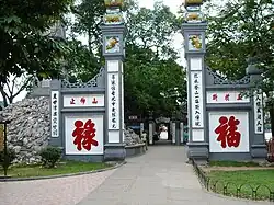 En entrant sur la gauche, un petit terre-plein de pierres, est élevé en mémoire d'une victoire militaire remportée par les Annamites vers la fin du XVIIIe siècle. Ce terre-plein est surmonté d'un obélisque coiffé d'une couverture en forme de pinceau, (en vietnamien Thap But) appelée tour du pinceau, édifié au milieu du XIXe siècle. Plus loin, on franchit le portique de l'écritoire (Daï Nghien) dont les soutiens sont recouverts de préceptes, et de trois mots « Ta Thanh Thien » (qui signifie : écrit sur le ciel)[2]. Le pavillon Tran Ba (pavillon d'interception de vagues) et la demeure de possession de la lune (Dac Nguyet).