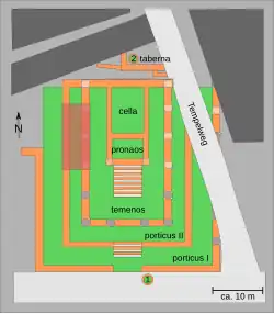 Une fontaine d'origine médiévale se trouve à l'entrée sud du monument (1). De là, on accède par un escalier au péristyle intérieur (porticus II), puis au temenos, espace sacré, qui mène au pronaos, entrée du temple, puis à la cella, espace fermé dédié à la divinité.