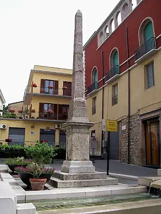 L'information sur le plus connu des deux obélisques commence en 1597, durant le pontificat du pape Clément VIII et de l'évêché de Massimiliano Palombara : cette année-là, il fut placé devant la cathédrale de Bénévent, couronné d'une boule de bronze avec une croix, et dédié à la Vierge[7]. Supprimé en 1867 à l'occasion de l'agrandissement du Corso Garibaldi, il fut repositionné en 1872 sur la petite place Emilio Papiniano, où il se trouve encore aujourd'hui, installé sur un piédestal portant une inscription en latin et en grec.