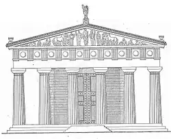 « Il y a un vase doré sur chaque coin du toit, et au milieu du fronton une Victoire aussi dorée ; au-dessus de la Victoire est un bouclier d'or, sur lequel est représentée la Gorgone Méduse. » — Pausanias : 5, 10, 4. Traduction M. Clavier, 1820.