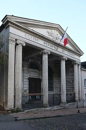 L'entrée monumentale est construite en 1877. Elle se compose de quatre colonnes ioniques rehaussées d'un fronton triangulaire, un style classique faisant référence à l'architecture civile de la Troisième République et affirmant la place retrouvé des protestants dans l'espace public[3]. Sur le tympan s'affiche une composition en bas-relief, avec une Bible ouverte typique des églises réformées, portant sur une croix inclinée. Sur la feuille de droite est gravée « la sainte Bible » et celle de gauche « Les saints Évangiles ». La Bible est accompagnée à droite d'une gerbe de blé, à gauche d'un cep de vigne avec grappe, signifiant les éléments eucharistiques, le pain et le vin. À une branche de cep est suspendu une aiguillère et un calice[4]. Sur la frise est gravé en lettres capitales « Église réformée de France ».