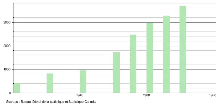 - ↑ Bureau fédéral de la statistique, recensements du Canada pour les années 1921, 1931, 1941, 1951, 1956, 1961 et 1966.