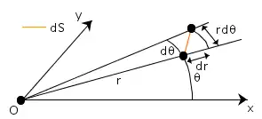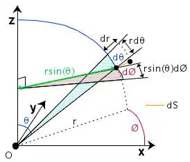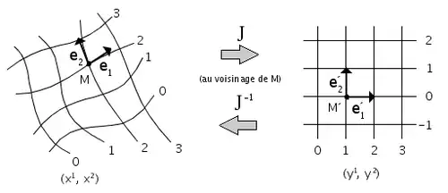Lorsqu'il s'agit d'un système de coordonnées curvilignes[6] (sur une variété différentielle ℳ de dimension ), nous ne pouvons pas y définir de base intrinsèque globale, car les vecteurs de la base (intrinsèque) locale varient lorsque le point courant (de coordonnées ) de ℳ varie. devient alors un champ tensoriel. Le «champ des bases locales» (appelé base holonome, basede coordonnées(en) ou repère lissede coordonnées) que l'on a utilisé repère des vecteurs infinitésimaux, donc peut être vu comme un «produit scalaire infinitésimal». On adopte alors l'écriture suivante: (où désigne la longueur de l'arc infinitésimal).