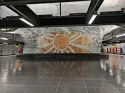 La décoration artistique de la station a été faite par Helga Henschen (sv) sur le thème d' Une rose pour les immigrés (En ros till invandrarna en suédois). Ce thème comporte comme maître-mot, la fraternité. 18 toiles de peintures furent peintes, et chaque toile est écrite avec une langue différente.