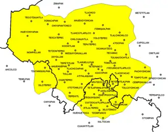 La région septentrionale de la Vallée de Mexico n'a jamais été bien définie, mais elle inclut les provinces de Hueypoxtla et Axacopan[4]. Il est dit qu'elle commence à la fin d'Otompan, les altepeme comme Huehuetoca, Coyotepec, Zitlaltepec, Itzcuincuitlapillan, Hueypoxtla, Tzompanco, Xilotzinco, Tequixquiac, Tetlapanaloya, Apazco, Ajoloapan, Zacacalco, Tetzontlalpan, Tolcayohcan, Tizayohcan, Tetzontepec, Cempoalan, Pachuca, Coscotitlan, Nopalapa, Nopancalco, Epazoyohcan et s'étend à travers la vallée aride connue actuellement sous le nom de Mezquital Valley vers des lieux tels que Tepexi, Chantepec, Atotonilco, Tlachcoapan[5], Atitalaquia, Tetepanco, Tolnacuxtla, Tecama, Chilcuautla, Tepatepec, Mizquiahuala, Ixmiquilpan, Zimapan, Nopala, Tecozautla, Actopan, Chapantongo et toute la région bordant la cité mythique de Tula.