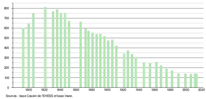 - ↑ Par convention dans Wikipédia, le principe a été retenu de n’afficher dans le tableau des recensements et le graphique, pour les populations légales postérieures à 1999, que les populations correspondant à une enquête exhaustive de recensement pour les communes de moins de 10 000 habitants, et que les populations des années 2006, 2011, 2016, etc. pour les communes de plus de 10 000 habitants, ainsi que la dernière population légale publiée par l’Insee pour l'ensemble des communes.