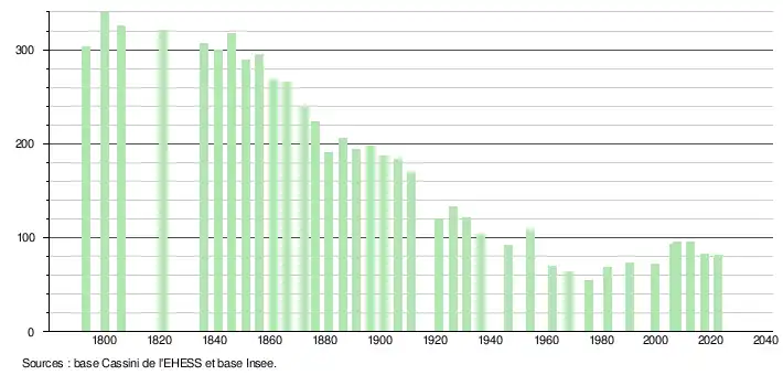 L'évolution du nombre d'habitants est connue à travers les recensements de la population effectués dans la commune depuis 1793. Pour les communes de moins de 10 000 habitants, une enquête de recensement portant sur toute la population est réalisée tous les cinq ans, les populations de référence des années intermédiaires étant quant à elles estimées par interpolation ou extrapolation[21]. Pour la commune, le premier recensement exhaustif entrant dans le cadre du nouveau dispositif a été réalisé en 2007[22].
