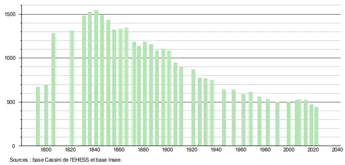 L'évolution du nombre d'habitants est connue à travers les recensements de la population effectués dans la commune depuis 1793. Pour les communes de moins de 10 000 habitants, une enquête de recensement portant sur toute la population est réalisée tous les cinq ans, les populations de référence des années intermédiaires étant quant à elles estimées par interpolation ou extrapolation[21]. Pour la commune, le premier recensement exhaustif entrant dans le cadre du nouveau dispositif a été réalisé en 2008[22].