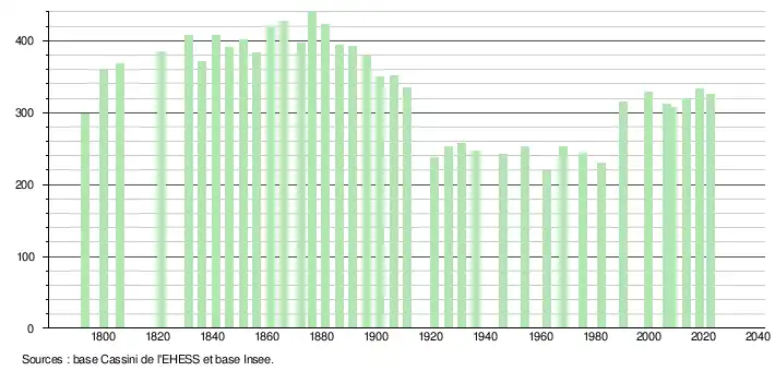 L'évolution du nombre d'habitants est connue à travers les recensements de la population effectués dans la commune depuis 1793. Pour les communes de moins de 10 000 habitants, une enquête de recensement portant sur toute la population est réalisée tous les cinq ans, les populations de référence des années intermédiaires étant quant à elles estimées par interpolation ou extrapolation[22]. Pour la commune, le premier recensement exhaustif entrant dans le cadre du nouveau dispositif a été réalisé en 2008[23].