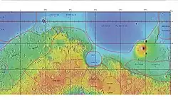 Image en fausses couleurs montrant Terra Sabaea et ses alentours (carte MOLA).