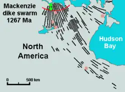 Les Territoires du Nord-Ouest contiennent l'essaim de dykes de Mackenzie, le plus grand essaim de dykes connu sur terre[6]. Il y a entre 1,269 et 1,267 milliard d'années, le craton du Lac des Esclaves a été partiellement soulevé et pénétré par l'essaim, rayonnant d'un panache provenant du centre-ouest de l'île Victoria. Il s'agit du dernier événement majeur à avoir affecté le cœur du craton, même si des événements magmatiques plus récents en ont affecté les bords.